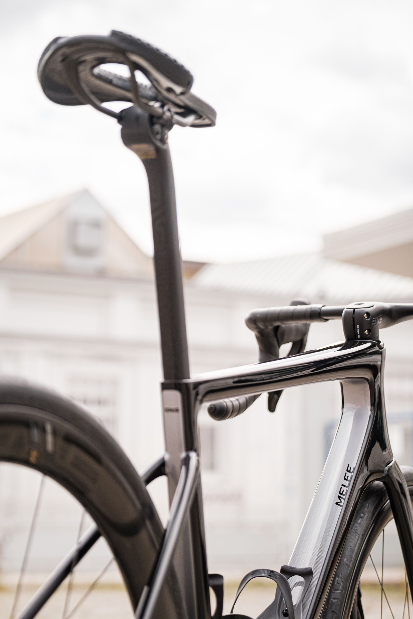 Für Matthias durften wir ein neues Projekt bauen: ein ENVE Melee, vollständig in Schwarz, mit viel Carbon-Einsatz und wie ein maßgeschneiderter Frack auf zwei Rädern.